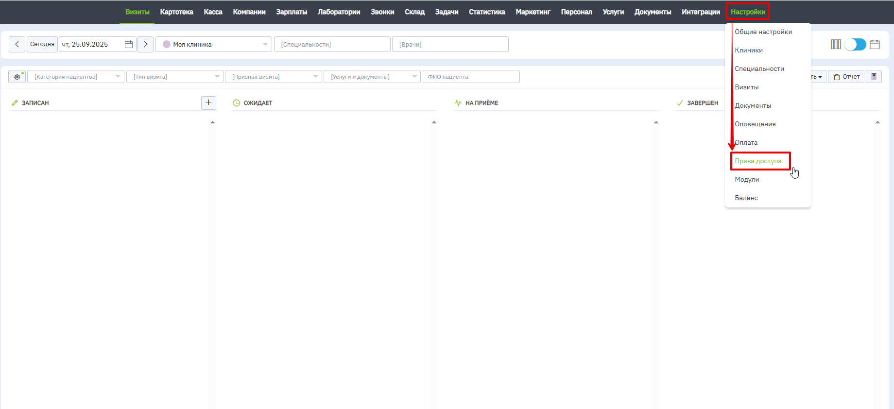 Все пациенты | доступ ко всем карточкам пациентов, без ограничений по исполнителю в визитах |
