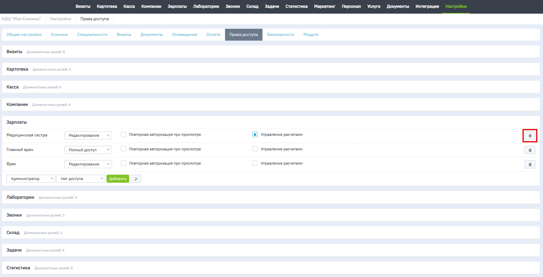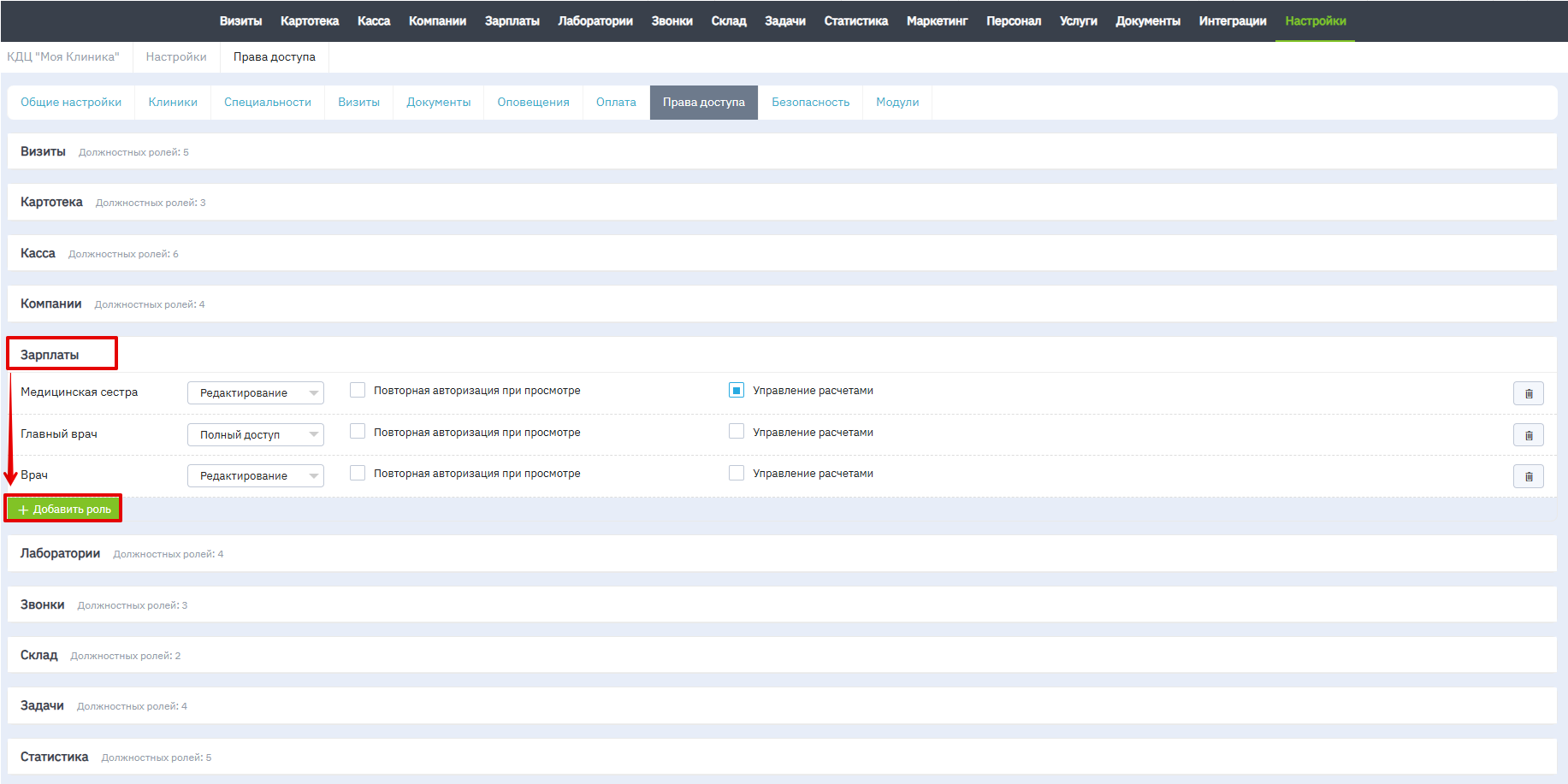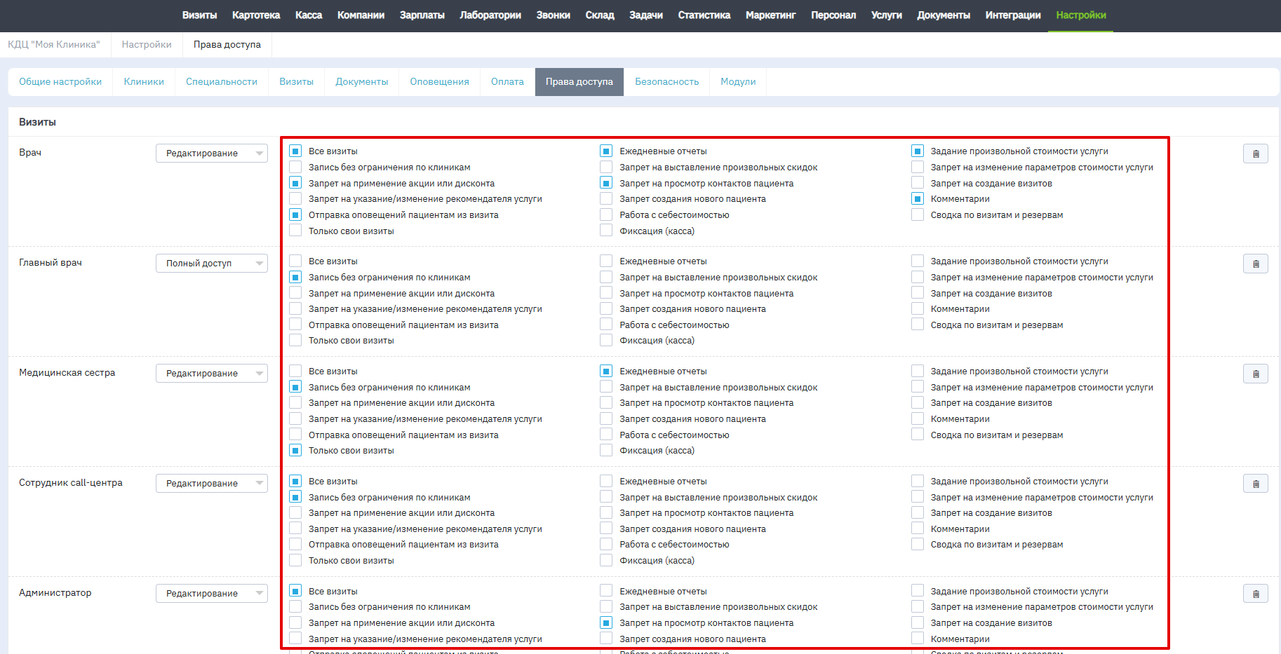 Права доступа назначаются не сотруднику напрямую, а должностной роли — системной или созданной пользователем (например врач, администратор и т.д)