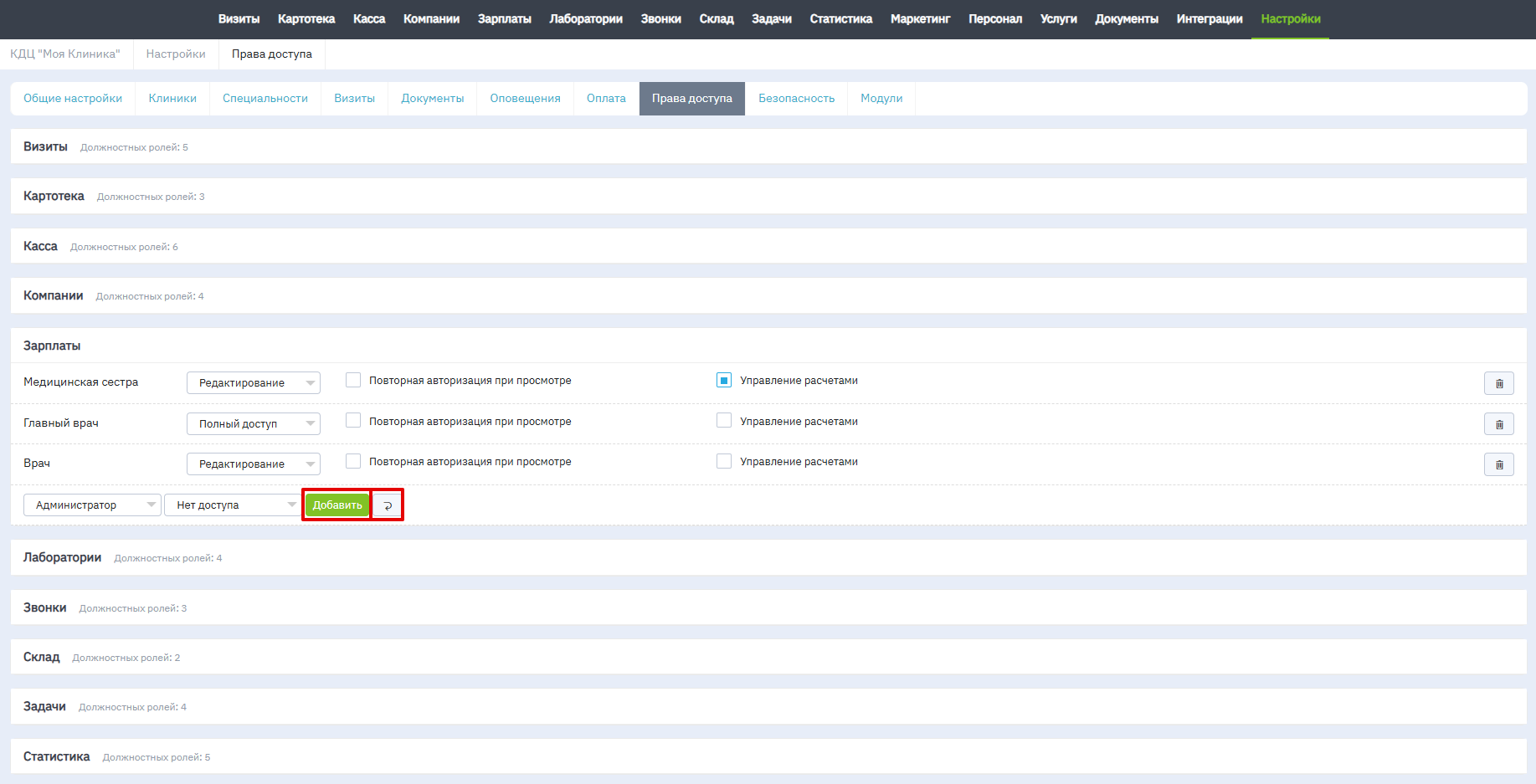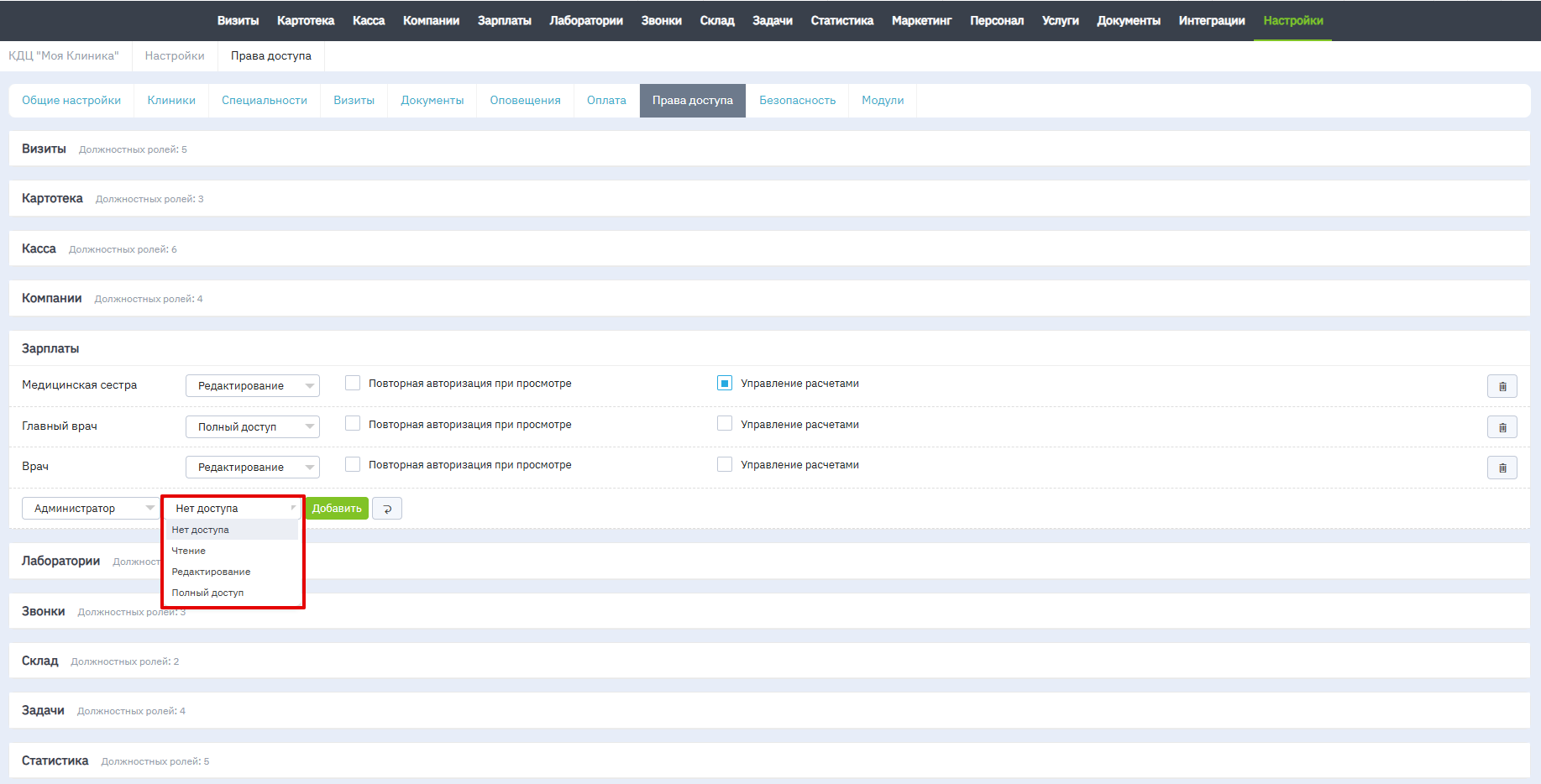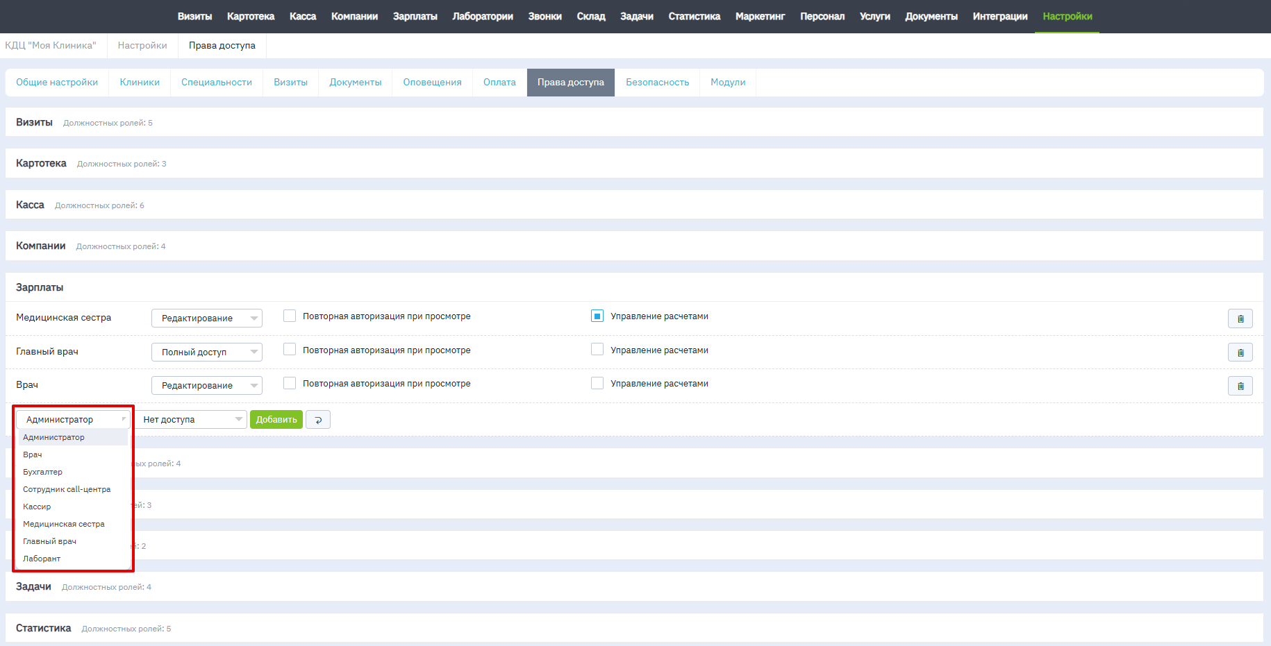 В выпадающем списке выберите роли, которым хотите открыть доступ. Там уже отображаются роли, настроенные в вашей клинике. |